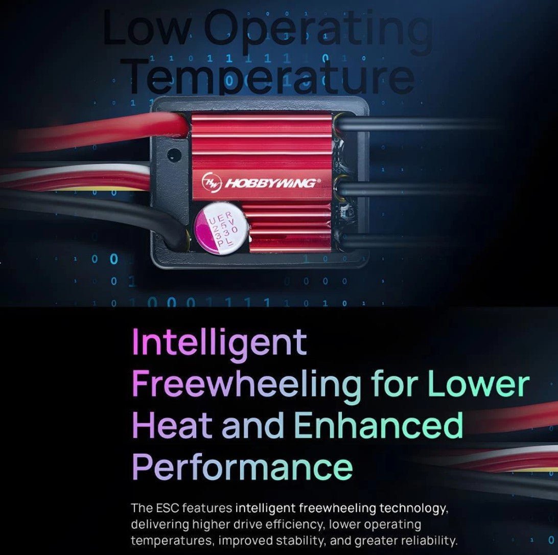 - The ESC features intelligent freewheeling technology, delivering higher drive efficiency, lower operating temperatures, improved stability, and greater reliability.
