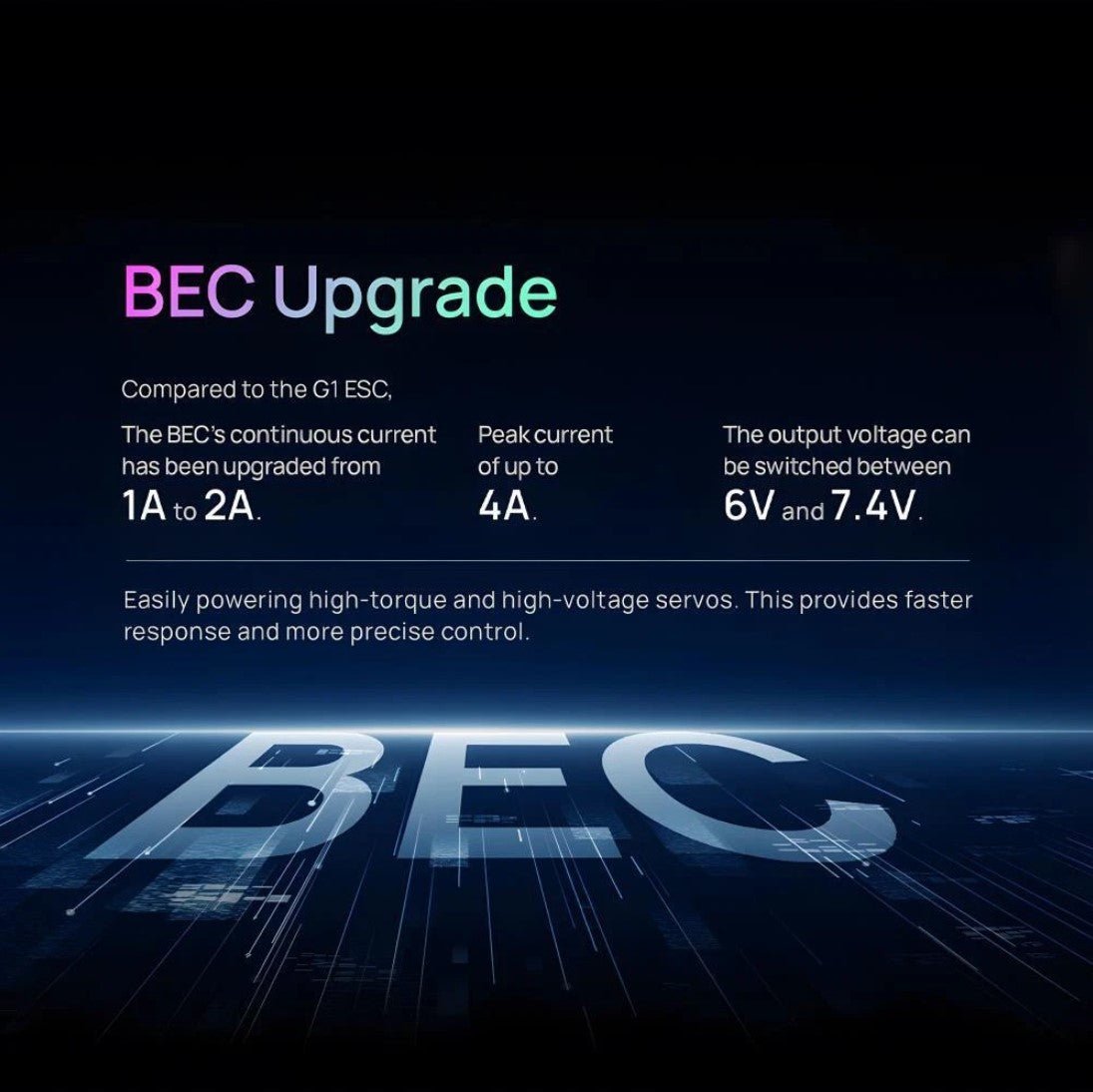 - Compared to the G1 ESC, the BEC’s continuous current has been upgraded from 1A to 2A, with a peak current of up to 4A. The output voltage can be switched between 6V and 7.4V. Easily powering high-torque and high voltage servos. This provides faster response and more precise control.