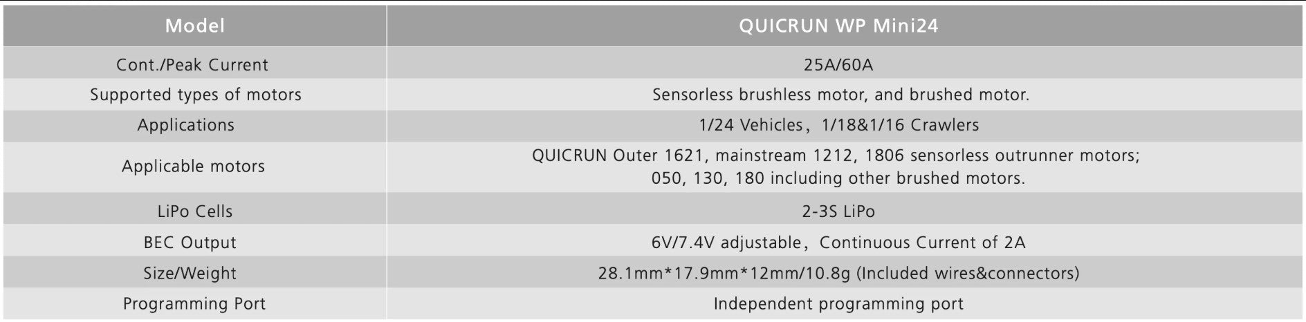 - Pair the QuicRun WP mini24 ESC with the QuicRun 1621SL Outer Motor to maximize performance and achieve optimal results.