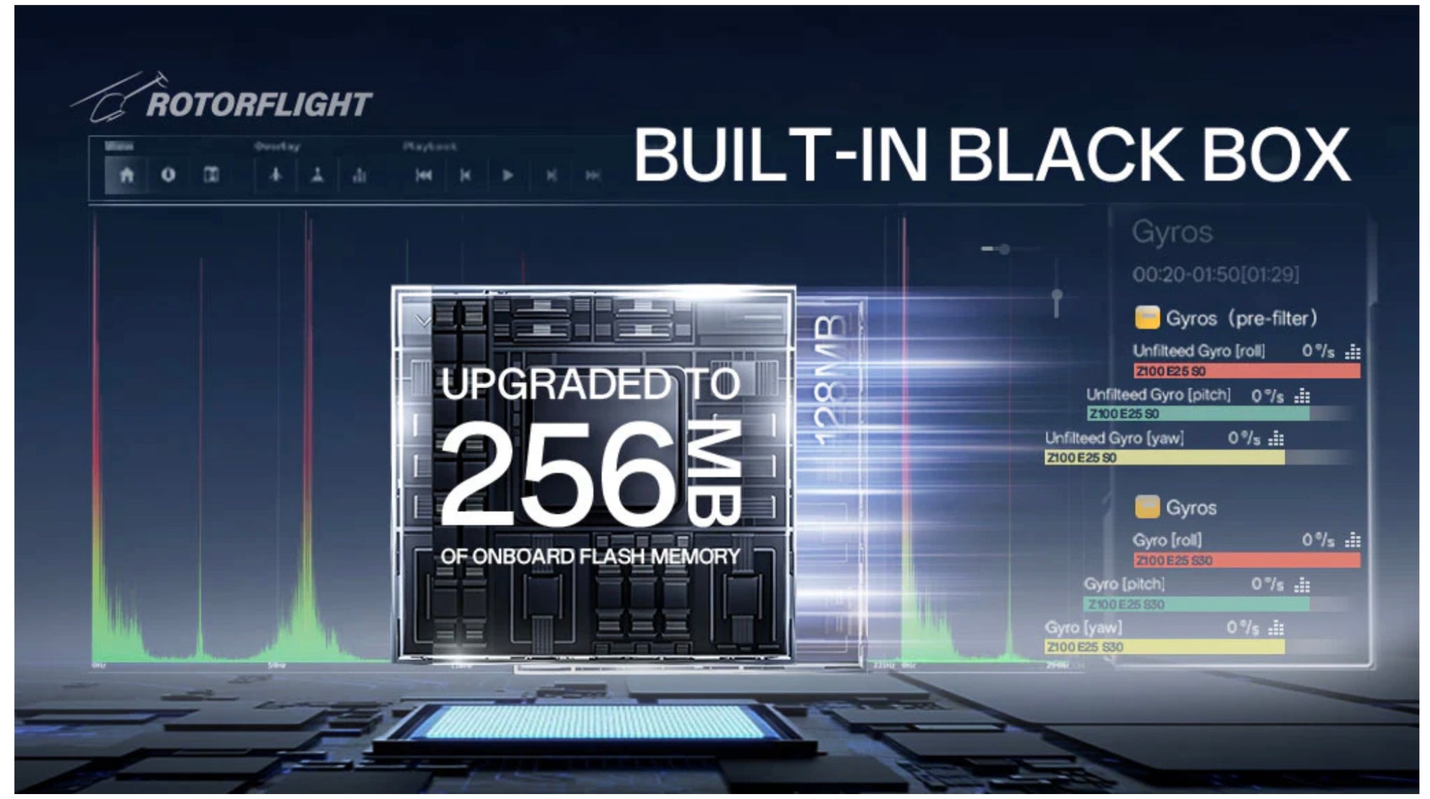 - Flight Logging: 256MB onboard flash memory for detailed logging and tuning.