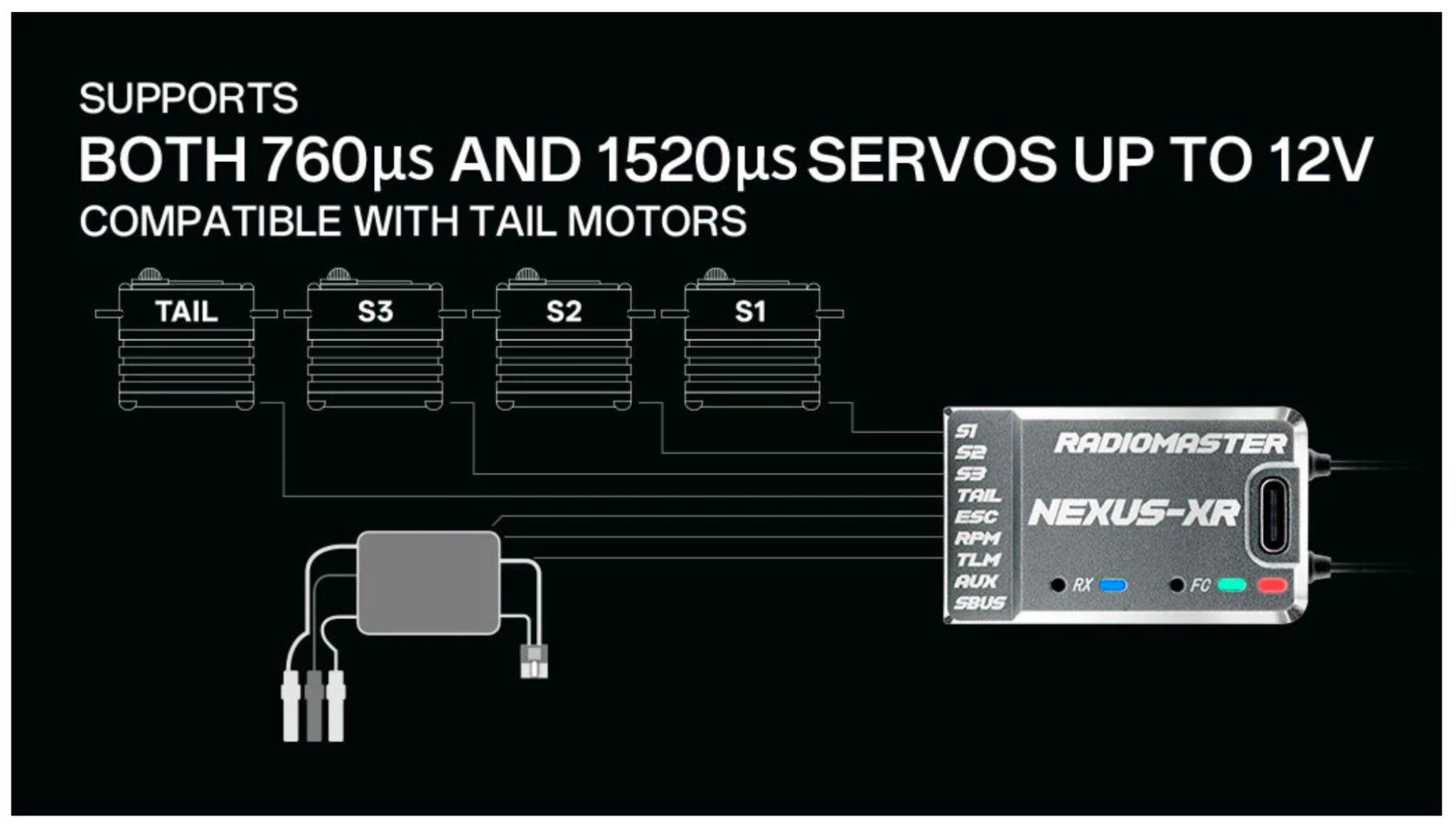 - Tail Servo/ESC Support: Compatible with 760μs/1520μs tail servos and ESCs.